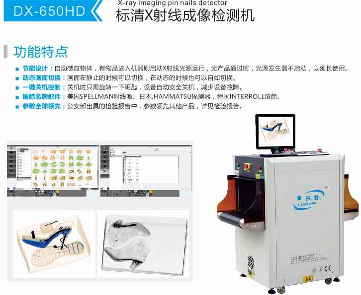 功能特點:DX-650HD X光鞋子驗針機,是一款標清的X光驗針釘設備,適合用于鞋子手袋箱包等工業生產質量檢測場所,是檢品環節一款重要的檢測儀器。