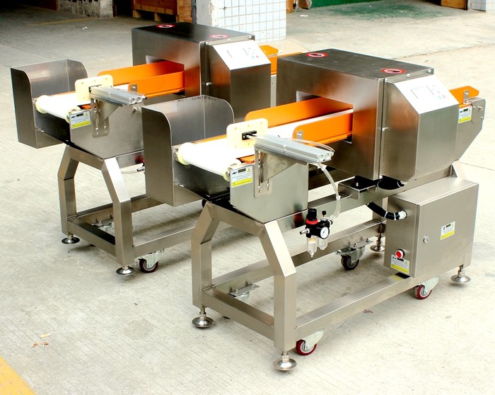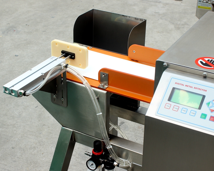 小包裝食品推桿式金屬檢測機,含有金屬異物的產品經過探頭時會被發現并自動推掉。適合配套小包裝食品流水線生產使用。
